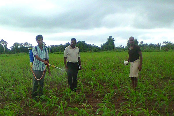 मक्का की खड़ी फसल में सूक्षम पोषक तत्व ज़िंक का पर्णीय छिड़काव करवाते हुये